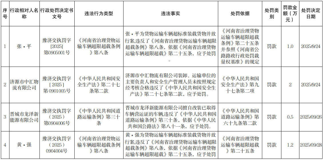 2025年9月24日至9月30日行政处罚结果