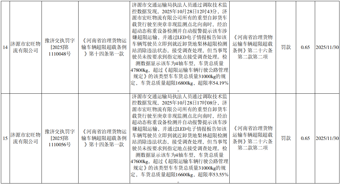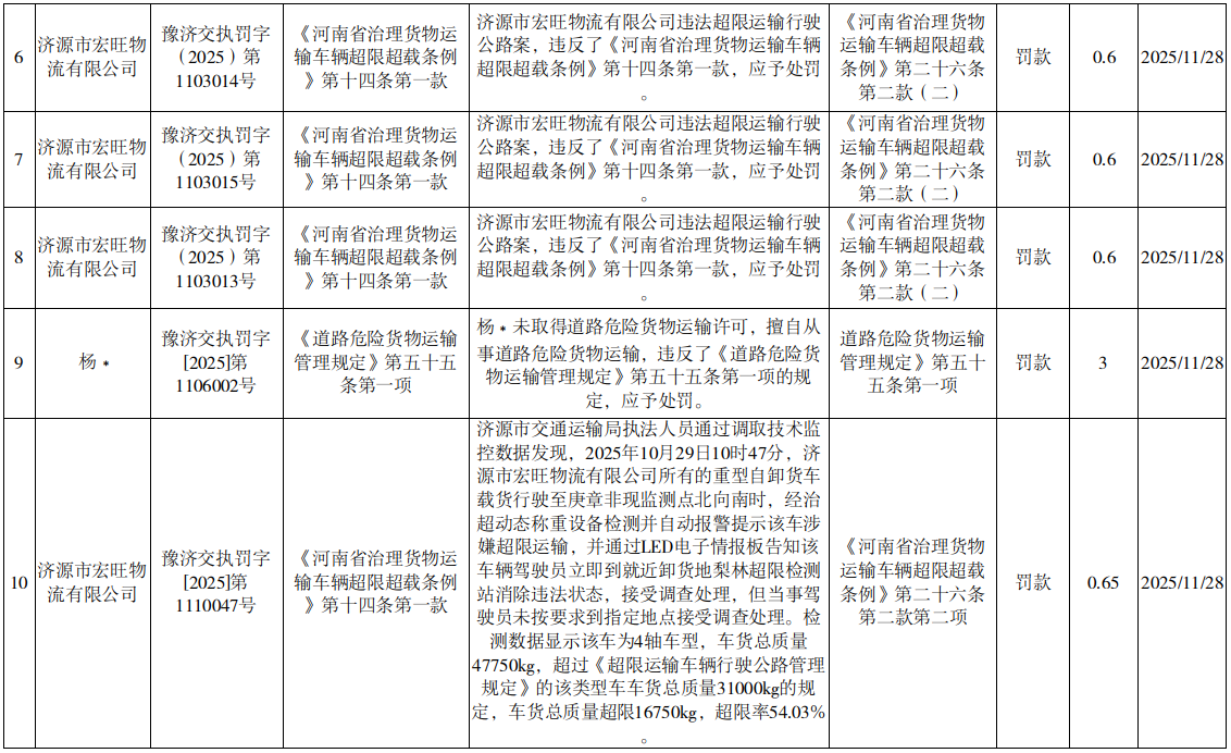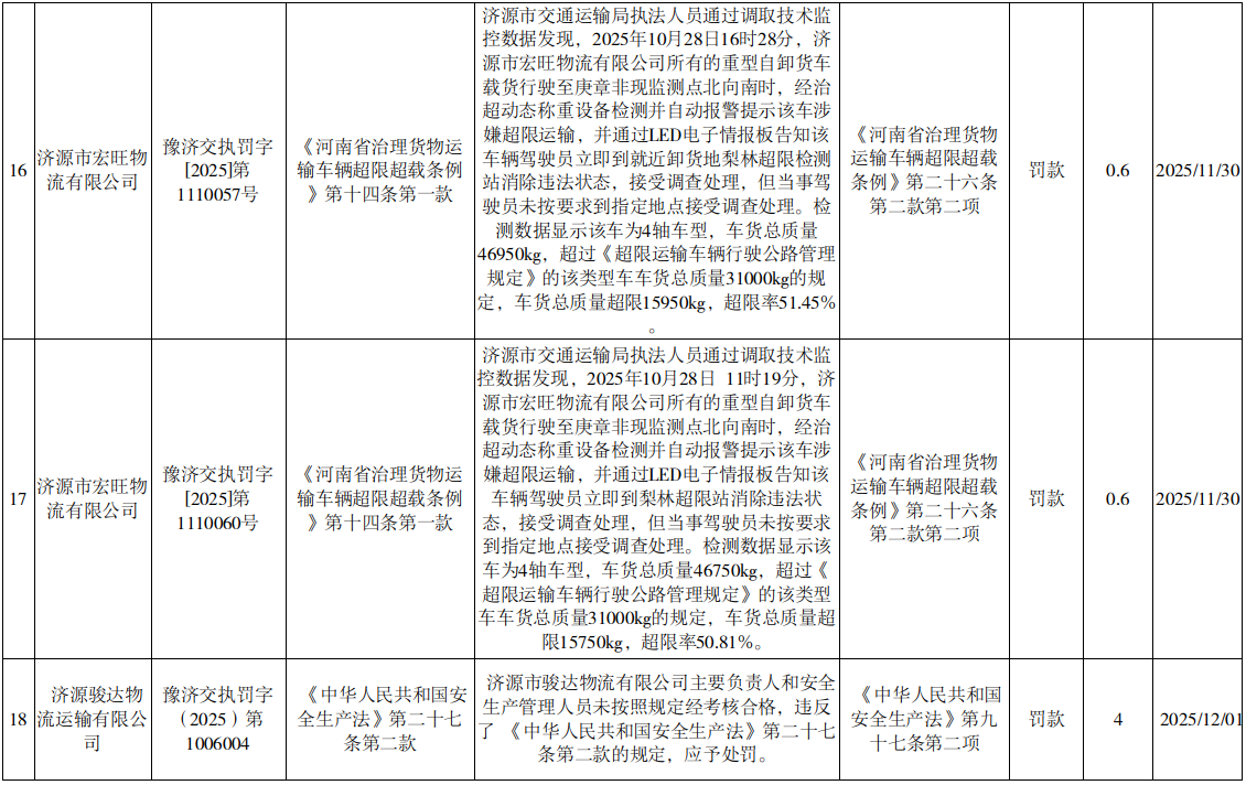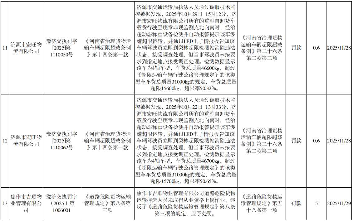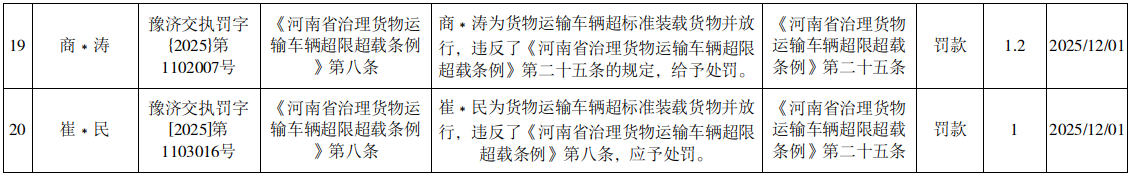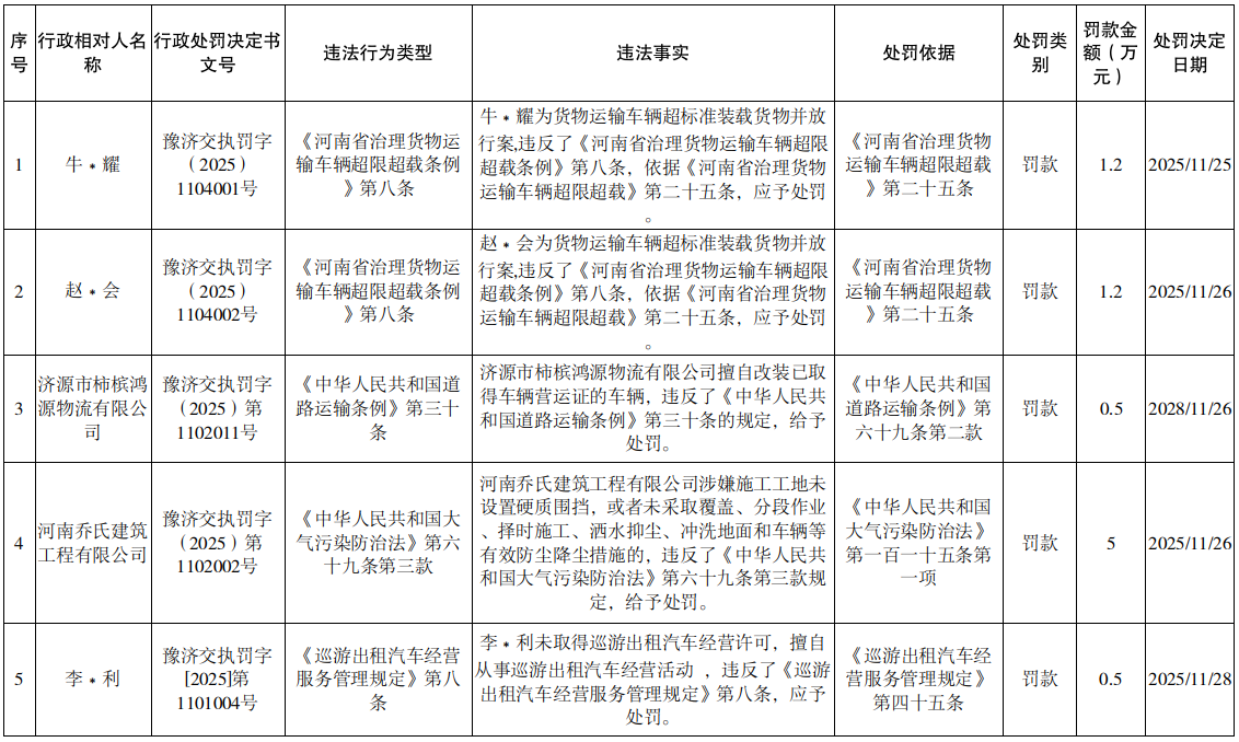2025年11月25日至12月1日行政处罚结果