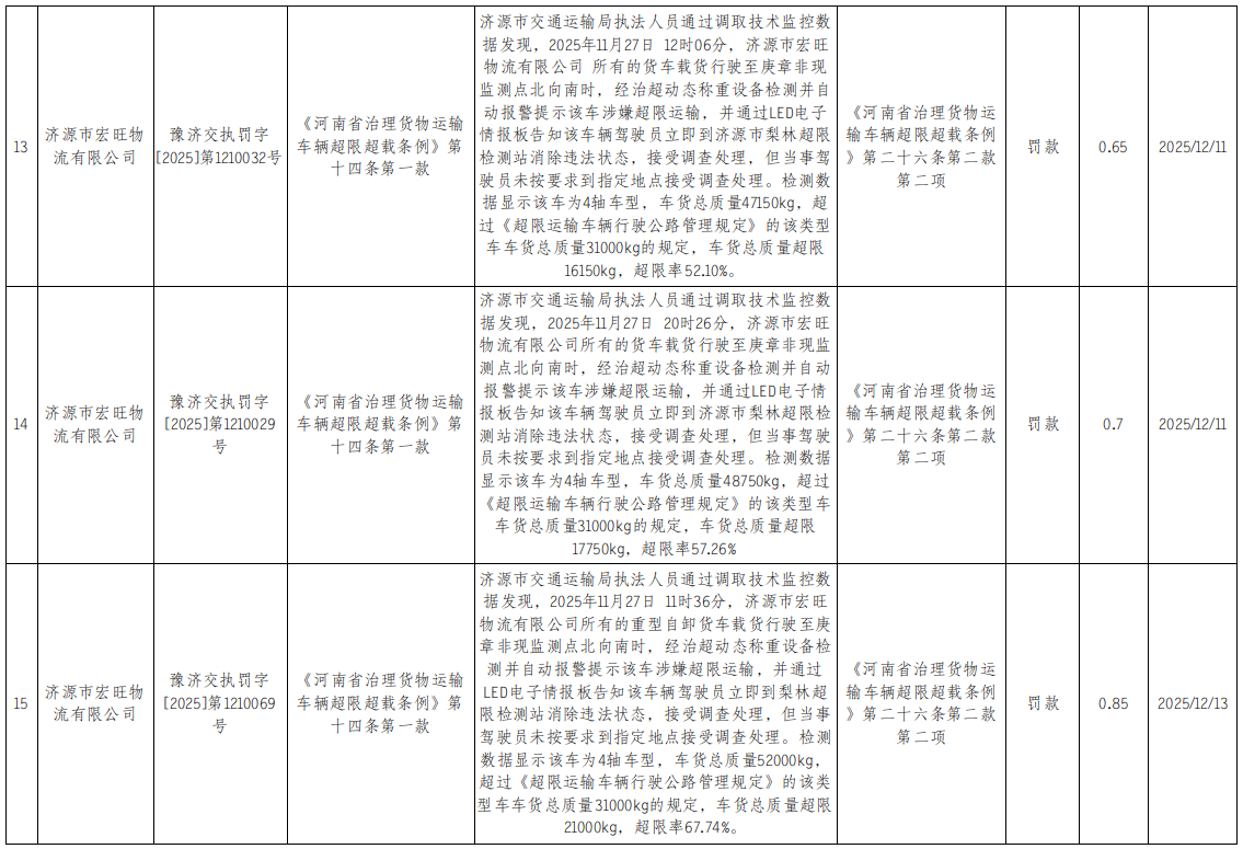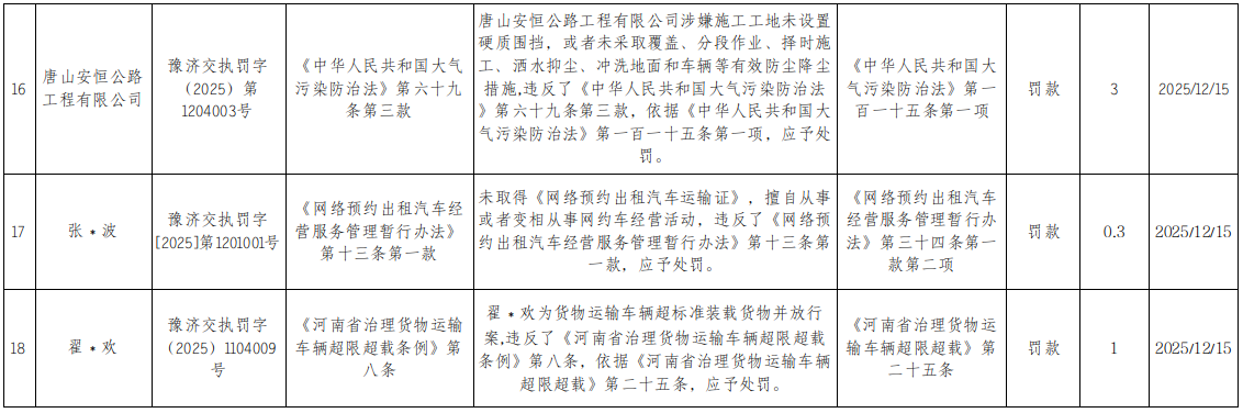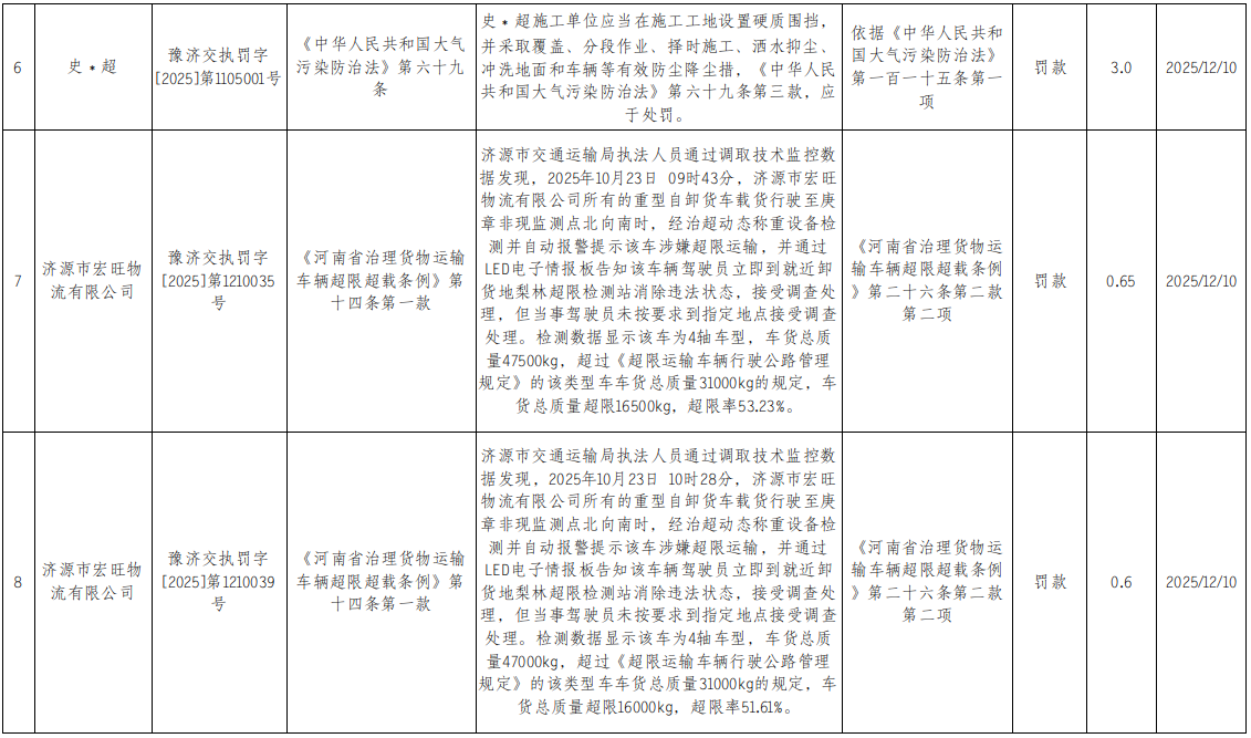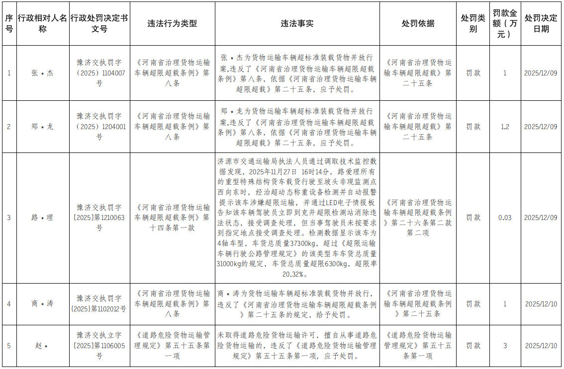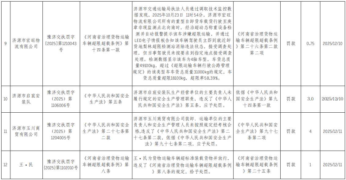 2025年12月9日至12月15日行政处罚结果