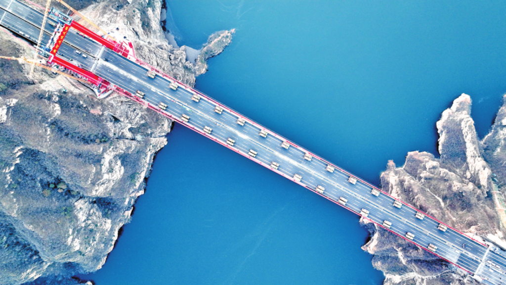 济新高速黄河三峡大桥位于济源与洛阳新安县交界处的王屋山—黛眉山世界地质公园,是世界首座独塔地锚式回转缆悬索桥。桥梁全长1688.5米,主跨555米,塔高109米,采用双向六车道高速公路标准建设。大桥以一桥飞跨黄河小浪底水库的雄姿,勾勒出黄河之上的交通新地标。据了解,为最大限度避开地质遗迹保护区,保护生态环境与地质地貌,项目团队创新性提出回转缆及相应锚碇设计,首创独塔地锚回转缆悬索桥桥型结构形式,实现了工程建设与生态保护的有机融合。