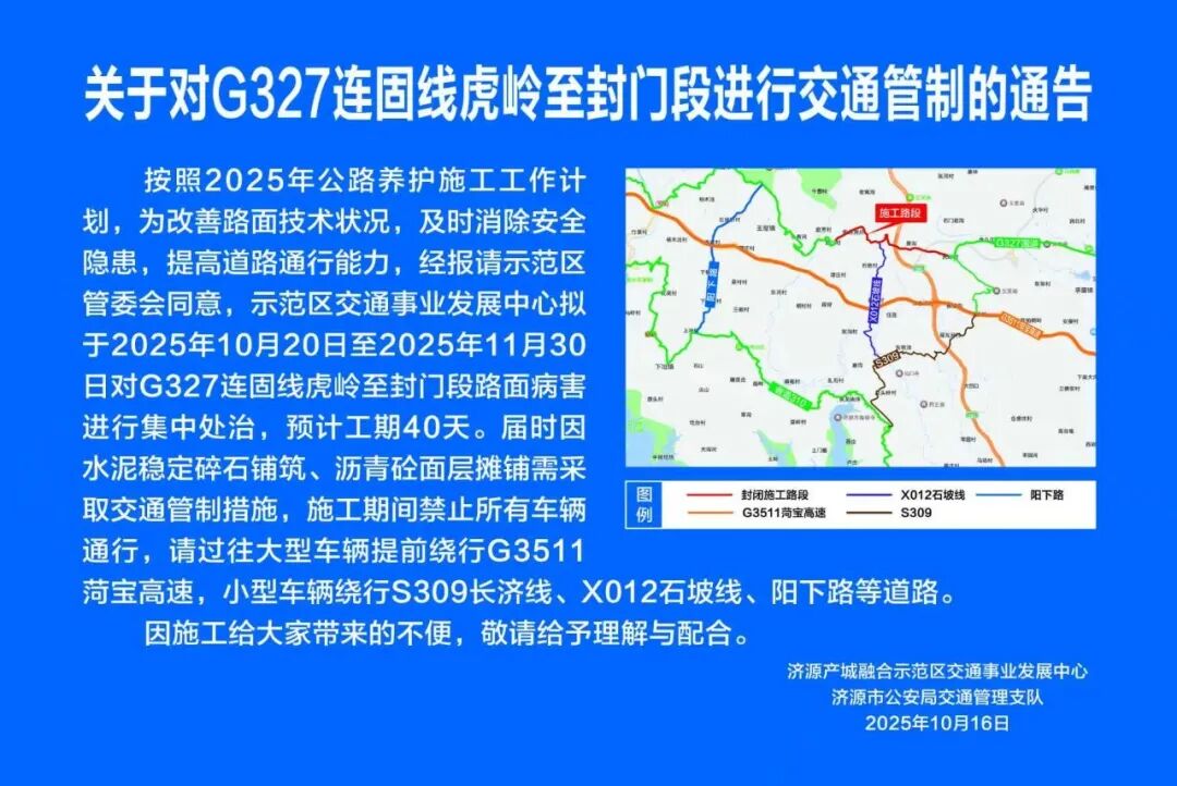 关于对G327连固线虎岭至封门段进行交通管制的通告