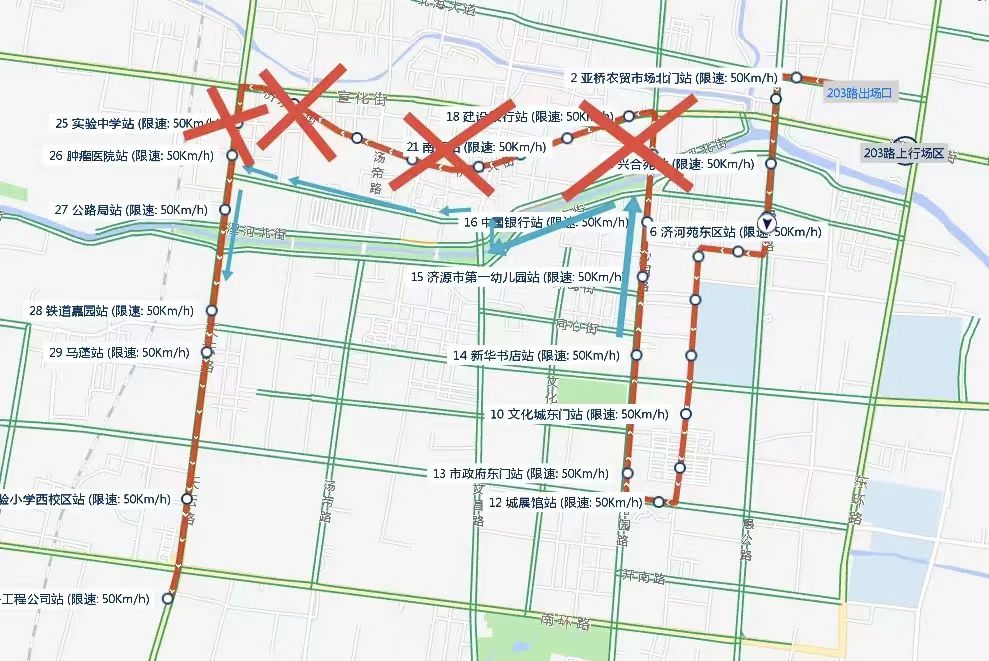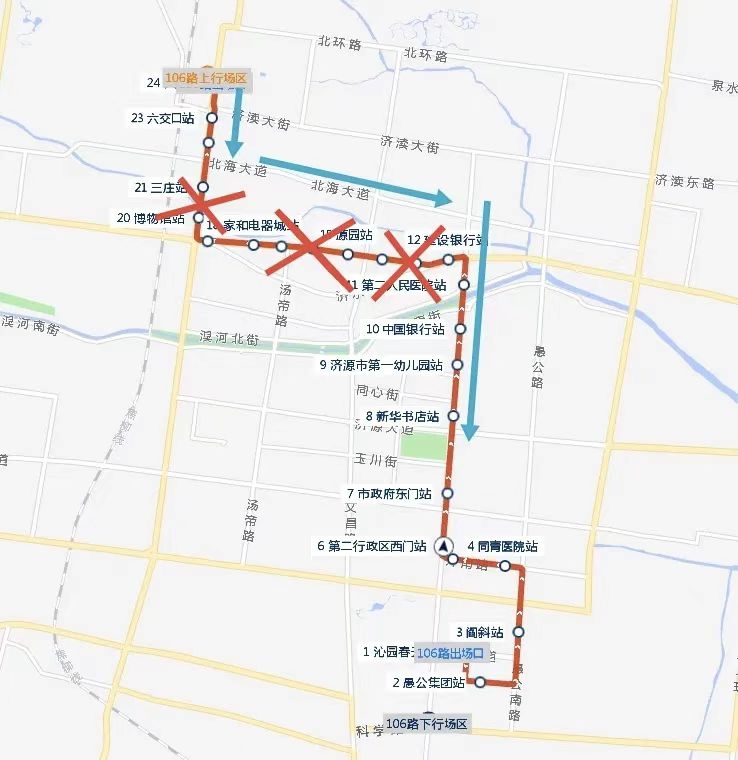 原线路:途经北海大道→愚公路→河苑街→文博路→黄河大道→沁园路→济水大街→文昌路→周园路→天坛路。