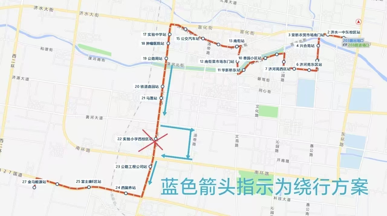 临时改线后:客运总站发车按原线路运营至天坛路交黄河大道红绿灯处左转→黄河大道向东→汤帝路向南→南环路向西至天坛路交南环路红绿灯处左转按原线路运营。暂时取消实验小学西校区站,改线后途经供电公司站、财政局站、中医院西门站、新妇女儿童医院站。