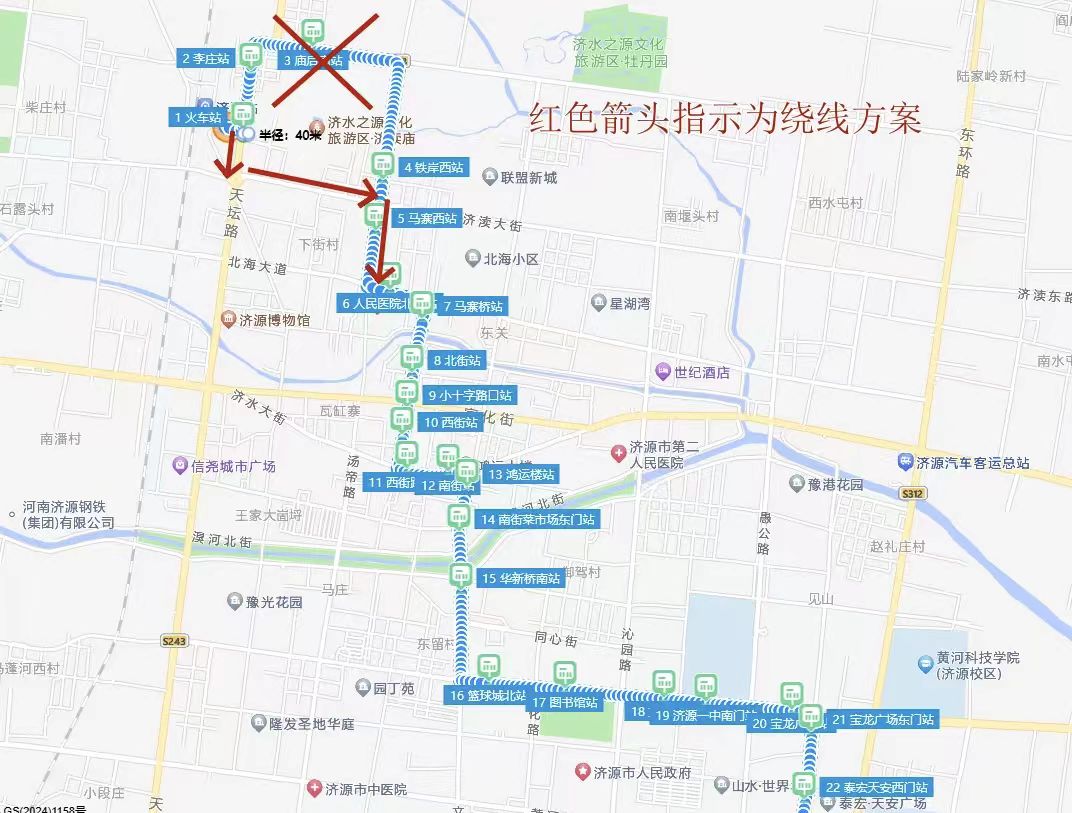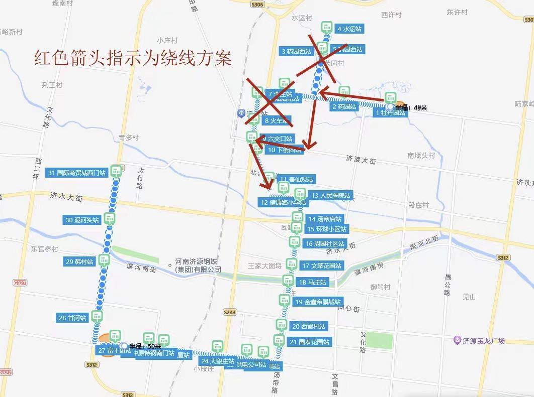 临时改线方案:火车站发车→天坛路向南→济渎大街向东→汤帝路向南按原线路运营。暂时取消李庄站、庙后南站、铁岸西站。