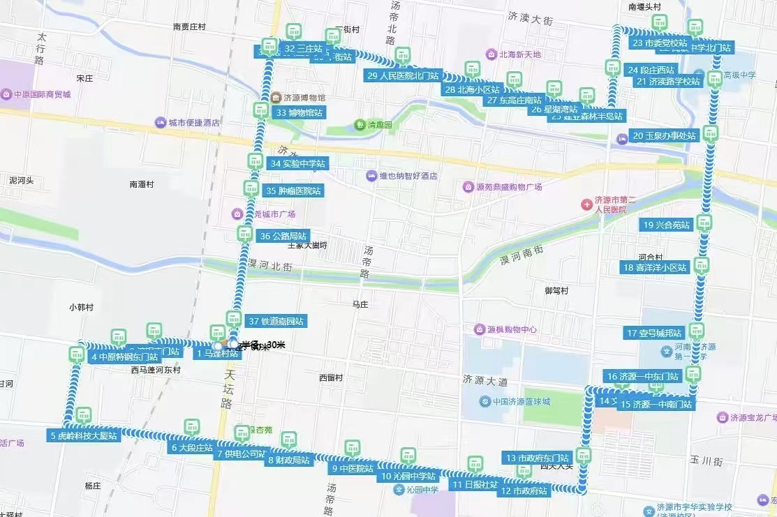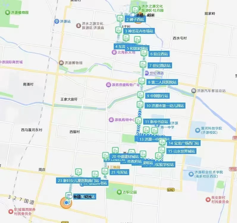 途经新站点:市政府东门站、文化城站、济源一中南门站、贰仟家站、段庄村西站、建业森林半岛站、星湖湾站、东高庄南站、北海小区站、人民医院北门站、下街站、北海实验小学站。